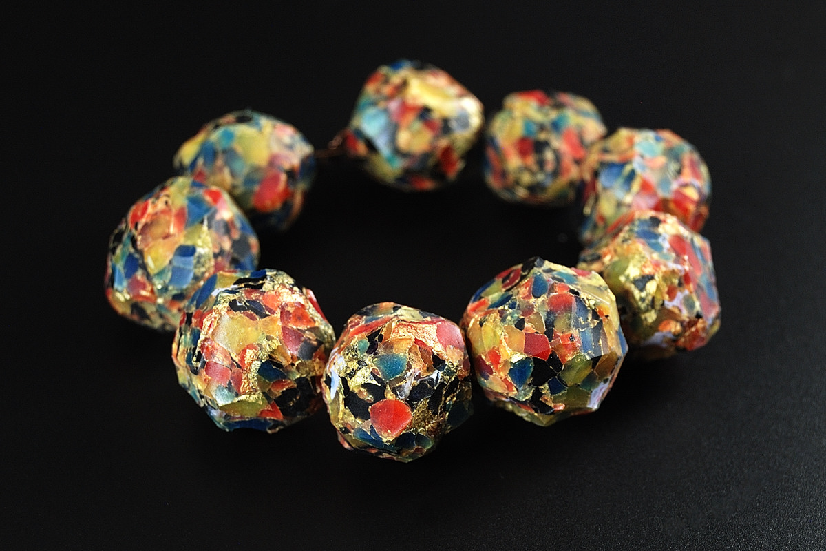 I used a tutorial from Rebekah Payne to make these opulent faceted beads with some old crumbly translucent clay, some black clay, and some gold paint.