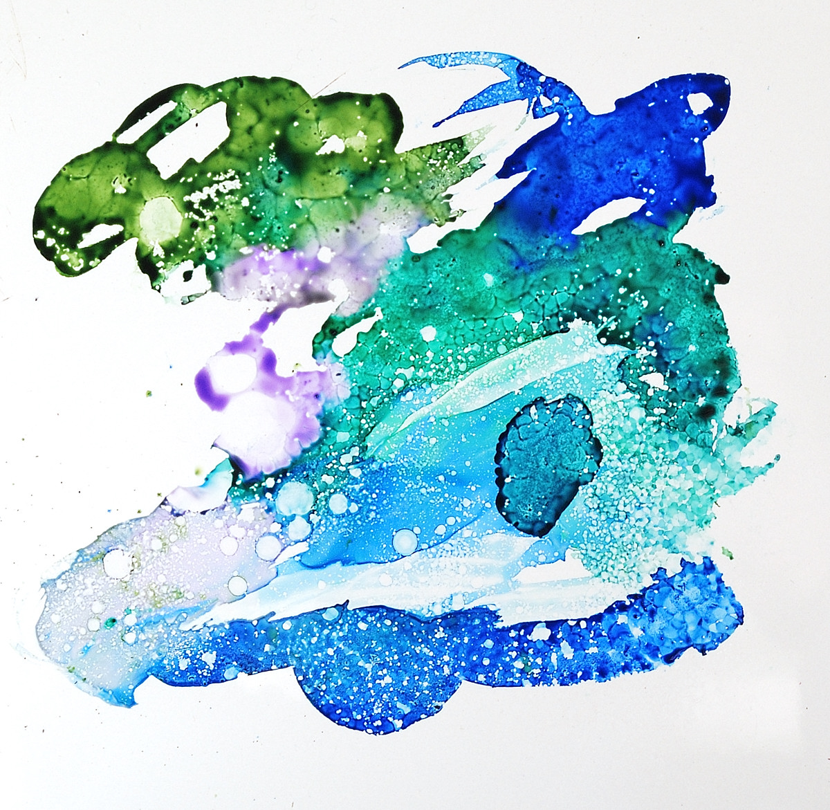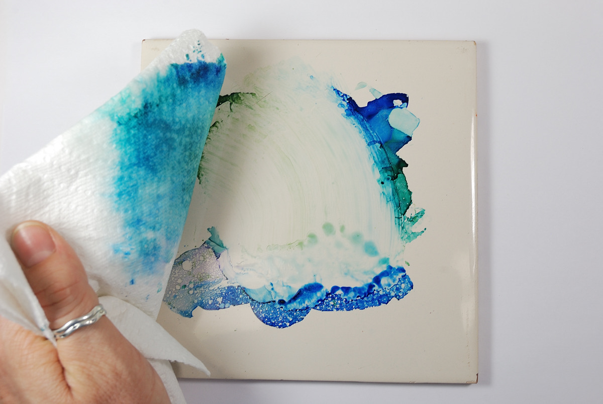 Another neat thing you can do with a spray bottle of rubbing alcohol goes back to the alcohol inks. Make a design with alcohol inks on a non-porous surface such as a ceramic tile or glass. Once the ink dries, it is waterproof. But you can, of course remove it with alcohol. But if you spray alcohol on the surface, it makes crazy designs in the ink! Totally fun.